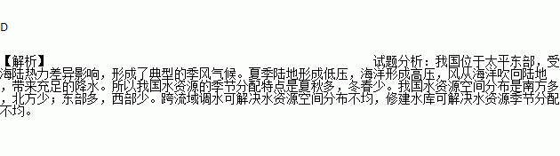 【解析】受季风气候的影响,我国水资源在空间上分布很不均匀。我国降水地区分布是从东南沿海向西北内陆递减,使得水资源东多西少,南多北少。我国耕地资源的分布是北多南少,水土配合不协调。故本题选A。