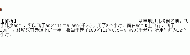 B 【解析】从甲地过北极到乙地,飞了纬度60°,所以飞了60×111=6 660(千米),用了8个小时。而在60°N上飞行,飞了180°,路程只有赤道上的一半,相当于走了180×111×0.5=9 990(千米),所用时间为12个小时。