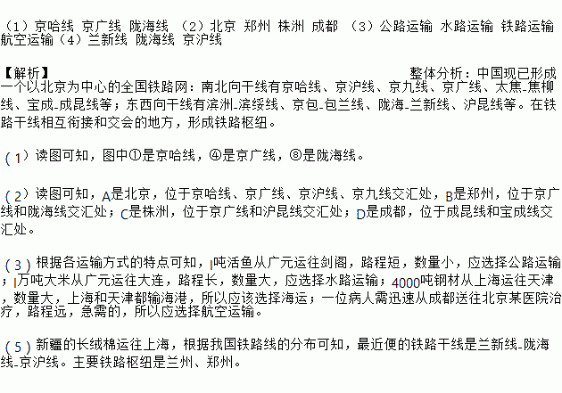 £¨1£©¾©¹þÏß ¾©¹ãÏß Â¤º£Ïß £¨2£©±±¾© Ö£ÖÝ ÖêÖÞ ³É¶¼ £¨3£©¹«Â·ÔËÊä ˮ·ÔËÊä Ìú·ÔËÊä º½¿ÕÔËÊ䣨4£©À¼ÐÂÏß Â¤º£Ïß ¾©»¦Ïß ¡¾½âÎö¡¿ÕûÌå·ÖÎö£ºÖйúÏÖÒÑÐγÉÒ»¸öÒÔ±±¾©ÎªÖÐÐĵÄÈ«¹úÌúÂ·Íø£ºÄϱ±Ïò¸ÉÏßÓо©¹þÏß¡¢¾©»¦Ïß¡¢¾©¾ÅÏß¡¢¾©¹ãÏß¡¢Ì«½¹-½¹ÁøÏß¡¢±¦³É-³ÉÀ¥Ïߵȣ»¶«Î÷Ïò¸ÉÏßÓбõÖÞ-±õËçÏß¡¢¾©°ü-°üÀ¼Ïß¡¢Â¤º£-À¼ÐÂÏß¡¢»¦À¥Ïߵȡ£ÔÚÌú·¸ÉÏßÏ໥ÏνӺͽ»»áµÄµØ·½£¬ÐγÉÌú·ÊàŦ¡£ £¨1£©¶Á...