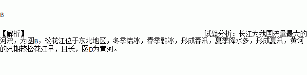 下面四幅图为我国长江、黄河、松花江、珠江四条河流的流量对比图,请你根据这四条河流的水文特征,判断A、B、C、D四幅图河流流量代表长江的是