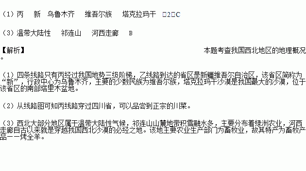 (1)经过我国地势三级阶梯的路线是____________,乙路线最终到达我国省区的简称是__________,行政中心是_________,主要的少数民族是___________,该省区有我国最大的_____________沙漠。