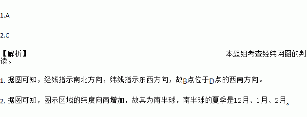 1.A 2.C 【解析】 本题组考查经纬网图的判读。 1. 据图可知,经线指示南北方向,纬线指示东西方向,故B点位于D点的西南方向。 2. 据图可知,图示区域的纬度向南增加,故其为南半球,南半球的夏季是12月、1月、2月。