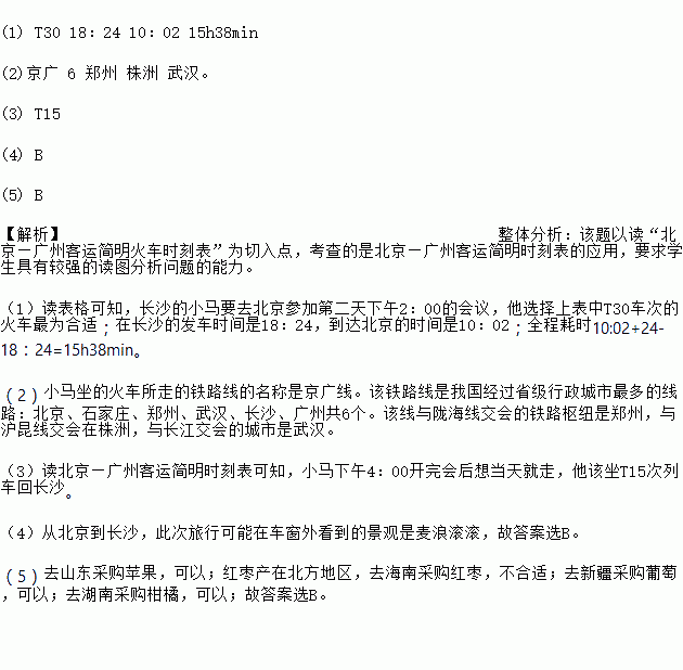 读“北京—广州客运简明火车时刻表”,回答问题。