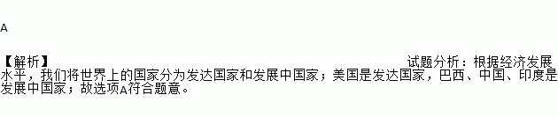 A 【解析】试题分析:根据经济发展水平,我们将世界上的国家分为发达国家和发展中国家;美国是发达国家,巴西、中国、印度是发展中国家;故选项A符合题意。