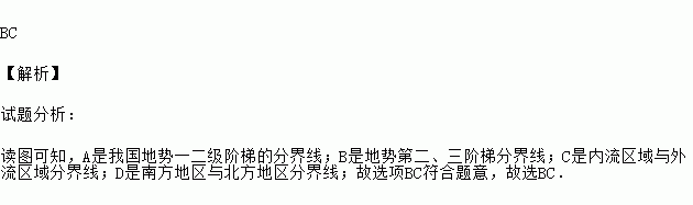 BC 【解析】 试题分析: 读图可知,A是我国地势一二级阶梯的分界线;B是地势第二、三阶梯分界线;C是内流区域与外流区域分界线;D是南方地区与北方地区分界线;故选项BC符合题意,故选BC.
