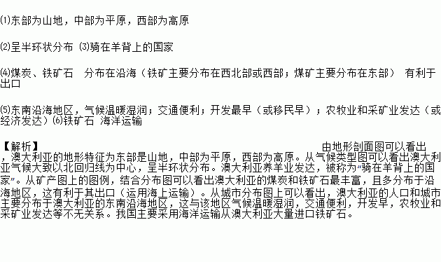 ¢Å¶«²¿ÎªÉ½µØ£¬Öв¿ÎªÆ½Ô£¬Î÷²¿Îª¸ßÔ ¢Æ³Ê°ë»·×´·Ö²¼ ¢ÇÆïÔÚÑò±³ÉϵĹú¼Ò ¢Èú̿¡¢Ìú¿óʯ·Ö²¼ÔÚÑØº££¨Ìú¿óÖ÷Òª·Ö²¼ÔÚÎ÷±±²¿»òÎ÷²¿£»Ãº¿óÖ÷Òª·Ö²¼ÔÚ¶«²¿£© ÓÐÀûÓÚ³ö¿Ú ¢É¶«ÄÏÑØº£µØÇø£¬ÆøºòÎÂůʪÈó£»½»Í¨±ãÀû£»¿ª·¢×îÔ磨»òÒÆÃñÔ磩£»Å©ÄÁÒµºÍ²É¿óÒµ·¢´ï£¨»ò¾¼Ã·¢´ï£©¢ÊÌú¿óʯ º£ÑóÔËÊä ¡¾½âÎö¡¿ÓɵØÐÎÆÊÃæÍ¼¿ÉÒÔ¿´³ö£¬°Ä´óÀûÑǵĵØÐÎÌØÕ÷Ϊ¶«²¿ÊÇɽµØ£¬Öв¿ÎªÆ½Ô£¬Î÷²¿Îª¸ßÔ¡£´ÓÆøºòÀàÐÍͼ...