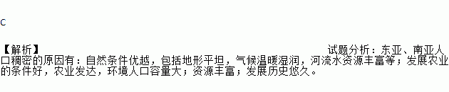 C 【解析】试题分析:东亚、南亚人口稠密的原因有:自然条件优越,包括地形平坦,气候温暖湿润,河流水资源丰富等;发展农业的条件好,农业发达,环境人口容量大;资源丰富;发展历史悠久。