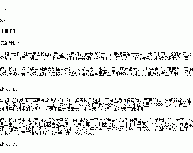 长江是我国长度最长、水量最大、流域面积最广的河流,有“水能宝库”和“黄金水道”之称.根据所学知识完成问题.
