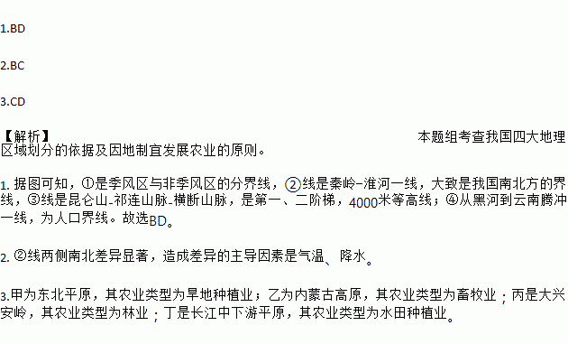 1.BD 2.BC 3.CD 【解析】 本题组考查我国四大地理区域划分的依据及因地制宜发展农业的原则。 1. 据图可知,①是季风区与非季风区的分界线,②线是秦岭-淮河一线,大致是我国南北方的界线,③线是昆仑山-祁连山脉-横断山脉,是第一、二阶梯,4000米等高线;④从黑河到云南腾冲一线,为人口界线。故选BD。 2. ②线两侧南北差异显著,造成差异的主导因素是气温、降水...