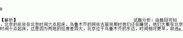 B ¡¾½âÎö¡¿ÊÔÌâ·ÖÎö£ºÓÉÌâÄ¿¿ÉÖª£¬±±¾©µÄÒÀÒÀÔÚ±±¾©Ê±¼äÁùµãÆð´²£¬ÎÚ³ľÆëµÄ°¢ÒÀ¹ÅÀö˵ÄÇʱËûÃÇ»¹ÔÚ˯¾õ£¬ËûÃÇ´ó¸ÅÔÚ±±¾©Ê±¼äÊ®µãÆð´²£¬ÕâÊÇÒòΪÁ½µØµÄ¾¶È²îÒì´ó£¬±±¾©Î»ÓÚÎÚ³ľÆëµÄ¶«±ß£¬Ê±¼äÏà¶Ô¸üÔ磬¹ÊÑ¡B.