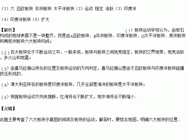 (1)板块学说认为,由岩石组成的地球表层并不是整体一块,而是分为 大板块.写出图中板块的名称:A ,B ,D .