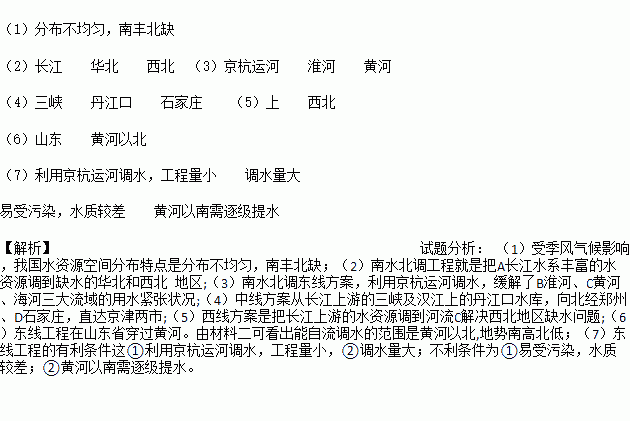 (2)南水北调工程就是把A_______水系丰富的水资源调到缺水的_______和_______地区。