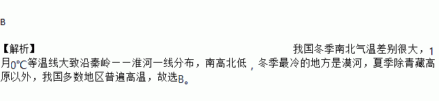 B 【解析】我国冬季南北气温差别很大,1月0℃等温线大致沿秦岭——淮河一线分布,南高北低,冬季最冷的地方是漠河,夏季除青藏高原以外,我国多数地区普遍高温,故选B。