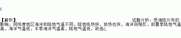 C 【解析】试题分析:受海陆分布的影响,同纬度地区海洋和陆地气温不同,陆地吸热快,放热也快,海洋则相反,故夏季陆地气温高,海洋气温低,冬季海洋气温高,陆地气温低,故选C.