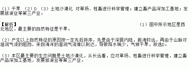 (1)干旱 (2)D (3)土地沙漠化 对草场、牲畜进行科学管理;建立畜产品深加工基地;发展旅游业等第三产业。 【解析】(1)图中所示地区是西北地区,最主要的自然特征是干旱。 (2)产生以上自然特征的原因按一定先后排序,先是由于深居内陆,距海较远,再由于山脉对湿润气流的阻挡,来自海洋的湿润气流难以到达,导致降水稀少,气候干旱,故选D。 (3)本区最主要的生态问题是土地沙漠化,从长...