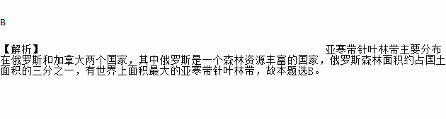 B 【解析】亚寒带针叶林带主要分布在俄罗斯和加拿大两个国家,其中俄罗斯是一个森林资源丰富的国家,俄罗斯森林面积约占国土面积的三分之一,有世界上面积最大的亚寒带针叶林带,故本题选B。