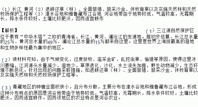 (1)长江 黄河(2)退耕还草(林)、全面禁猎、禁采沙金、休牧育草以及实施天然林和天然牧场保护工程等(3)湟水谷地和雅鲁藏布江谷地 河谷地带由于地势较低,气温较高,无霜期长,降水条件较好,土壤比较肥沃,因而适宜耕作 【解析】(1)三江源自然保护区位于素有“中华水塔”之称的青海省,长江、黄河、澜沧江的发源地。据初步估算,长江总水量的25%、黄河总水量的49%、澜沧江总水量的15%都来自这里。这...