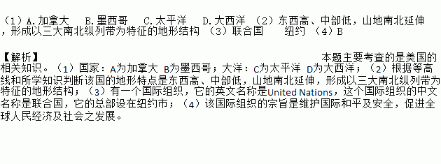 £¨1£©A.¼ÓÄôó B.Ä«Î÷¸ç C.̫ƽÑó D.´óÎ÷Ñó £¨2£©¶«Î÷¸ß¡¢Öв¿µÍ£¬É½µØÄϱ±ÑÓÉ죬ÐγÉÒÔÈý´óÄϱ±×ÝÁдøÎªÌØÕ÷µÄµØÐνṹ £¨3£©ÁªºÏ¹úŦԼ £¨4£©B ¡¾½âÎö¡¿±¾ÌâÖ÷Òª¿¼²éµÄÊÇÃÀ¹úµÄÏà¹ØÖªÊ¶¡££¨1£©¹ú¼Ò£ºAΪ¼ÓÄôó BΪīÎ÷¸ç£»´óÑó£ºCΪ̫ƽÑó DΪ´óÎ÷Ñ󣻣¨2£©¸ù¾ÝµÈ¸ßÏߺÍËùѧ֪ʶÅжϸùúµÄµØÐÎÌØµãÊǶ«Î÷¸ß¡¢Öв¿µÍ£¬É½µØÄϱ±ÑÓÉ죬ÐγÉÒÔÈý´óÄϱ±×ÝÁдøÎªÌØÕ÷µÄµØÐνṹ£»£¨3£©ÓÐ...