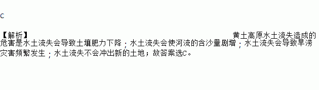 C 【解析】黄土高原水土流失造成的危害是水土流失会导致土壤肥力下降;水土流失会使河流的含沙量剧增;水土流失会导致旱涝灾害频繁发生;水土流失不会冲出新的土地;故答案选C。