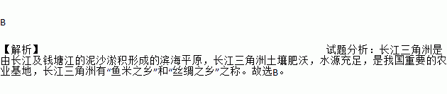 B 【解析】试题分析:长江三角洲是由长江及钱塘江的泥沙淤积形成的滨海平原,长江三角洲土壤肥沃,水源充足,是我国重要的农业基地,长江三角洲有“鱼米之乡”和“丝绸之乡”之称。故选B。