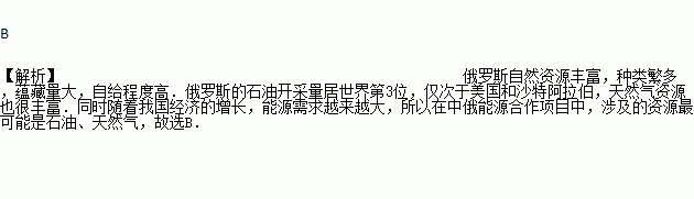 中国和俄罗斯是能源合作大国,在合作项目中涉及的资源最可能的是( )