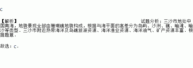 C 【解析】试题分析:三沙市地处中国南海,地貌景观全部由珊瑚礁地貌构成,根据与海平面的高差分为岛屿、沙洲、礁、暗滩、暗沙等类型.三沙市附近热带海洋及岛礁旅游资源、海洋渔业资源、海洋油气、矿产资源丰富.根据题意. 故选:C.