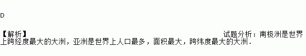 D 【解析】试题分析:南极洲是世界上跨经度最大的大洲,亚洲是世界上人口最多,面积最大,跨纬度最大的大洲.