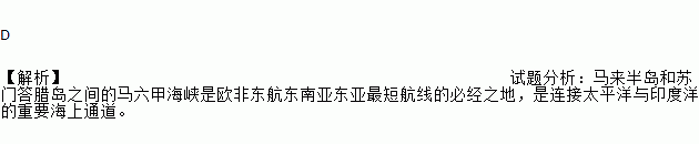 D 【解析】试题分析:马来半岛和苏门答腊岛之间的马六甲海峡是欧非东航东南亚东亚最短航线的必经之地,是连接太平洋与印度洋的重要海上通道。