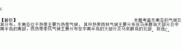 C ¡¾½âÎö¡¿ ±¾Ì⿼²é¶«ÄÏÑÇµÄÆøºò¼°Æä·Ö²¼¡£¶«ÄÏÑÇλÓÚÈÈ´øÖ÷ҪΪÈÈ´øÆøºò£¬ ÆäÖÐÈÈ´øÓêÁÖÆøºòÖ÷Òª·Ö²¼ÔÚÂíÀ´Èºµº´ó²¿·Ö¼°ÖÐÄϰ뵺µÄÄϲ¿£¬¶øÈÈ´ø¼¾·çÆøºòÖ÷Òª·Ö²¼ÔÚÖÐÄϰ뵺µÄ´ó²¿·Ö¼°ÂíÀ´ÈºµºµÄ±±²¿¡£¹ÊÑ¡C¡£