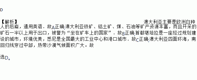 D 【解析】澳大利亚主要是欧洲白种人的后裔,通用英语.故A正确;澳大利亚铁矿、铝土矿、煤、石油等矿产资源丰富,而且开采的矿石一半以上用于出口,被誉为“坐在矿车上的国家”.故B正确;首都堪培拉是一座经过规划建设的城市,环境优美,悉尼是全国最大的工业中心和港口城市.故C正确;澳大利亚四面环海,南回归线穿过中部,热带沙漠气候面积广大。故 选D。