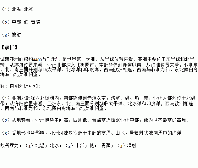 (3)受地形地势影响,亚洲河流多发源于中部的高原、山地,呈_______状流向周边的海洋。