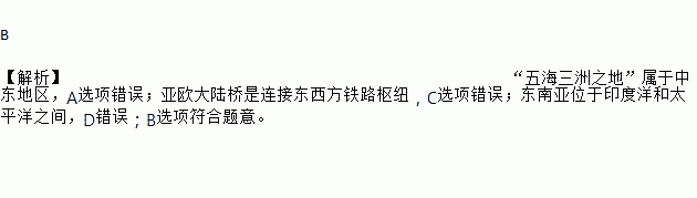 B 【解析】“五海三洲之地”属于中东地区,A选项错误;亚欧大陆桥是连接东西方铁路枢纽,C选项错误;东南亚位于印度洋和太平洋之间,D错误;B选项符合题意。