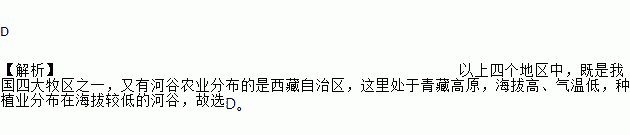 D 【解析】以上四个地区中,既是我国四大牧区之一,又有河谷农业分布的是西藏自治区,这里处于青藏高原,海拔高、气温低,种植业分布在海拔较低的河谷,故选D。