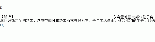 D 【解析】东南亚地区大部分位于南北回归线之间的热带,以热带季风和热带雨林气候为主,全年高温多雨,适合水稻的生长,故选D。