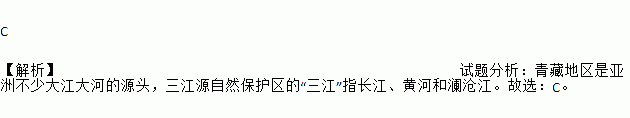 C 【解析】试题分析:青藏地区是亚洲不少大江大河的源头,三江源自然保护区的“三江”指长江、黄河和澜沧江。故选:C。