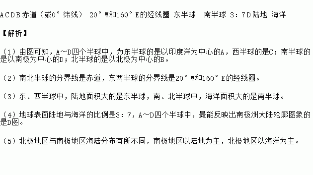 (4)地球表面陆地与海洋的比例是________。A~D四个半球中,最能反映出南极洲大陆轮廓图象的是________。(填字母)