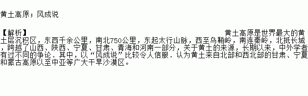 »ÆÍÁ¸ßÔ£»·ç³É˵ ¡¾½âÎö¡¿»ÆÍÁ¸ßÔÊÇÊÀ½ç×î´óµÄ»ÆÍÁ²ã³Á»ýÇø£¬¶«Î÷ǧÓ๫ÀÄϱ±750¹«À¶«ÆðÌ«ÐÐɽÂö£¬Î÷ÖÁÎÚÇÊÁ룬ÄÏÁ¬ÇØÁ룬±±µÖ³¤³Ç£¬¿çÔ½ÁËɽÎ÷¡¢ÉÂÎ÷¡¢ÄþÏÄ¡¢¸ÊËà¡¢ÇຣºÍºÓÄÏÒ»²¿·Ö£¬¹ØÓÚ»ÆÍÁµÄÀ´Ô´£¬³¤ÆÚÒÔÀ´£¬ÖÐÍâѧÕßÓйý²»Í¬µÄÕùÂÛ£®ÆäÖУ¬ÒÔ¡°·ç³É˵¡±±È½ÏÁîÈËÐÅ·þ£®ÈÏΪ»ÆÍÁÀ´×Ô±±²¿ºÍÎ÷±±²¿µÄ¸ÊËà¡¢ÄþÏĺÍÃɹŸßÔÒÔÖÁÖÐÑǵȹã´ó¸ÉºµÉ³Ä®Çø¡£