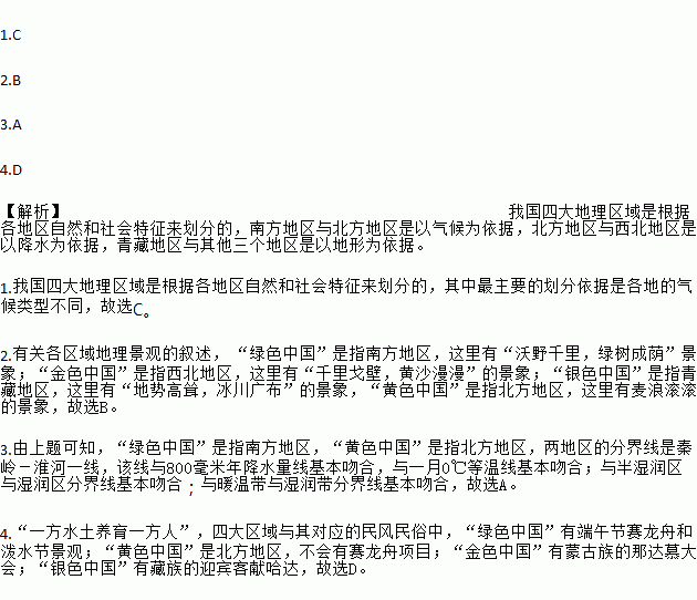 1.C 2.B 3.A 4.D 【解析】我国四大地理区域是根据各地区自然和社会特征来划分的,南方地区与北方地区是以气候为依据,北方地区与西北地区是以降水为依据,青藏地区与其他三个地区是以地形为依据。 1.我国四大地理区域是根据各地区自然和社会特征来划分的,其中最主要的划分依据是各地的气候类型不同,故选C。 2.有关各区域地理景观的叙述, “绿色中国”是指南方地区...