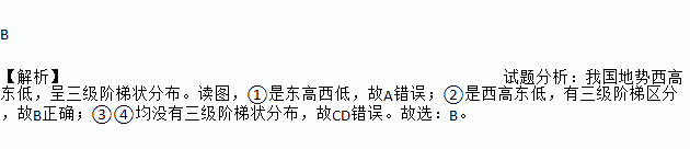 B 【解析】试题分析:我国地势西高东低,呈三级阶梯状分布。读图,①是东高西低,故A错误;②是西高东低,有三级阶梯区分,故B正确;③④均没有三级阶梯状分布,故CD错误。故选:B。