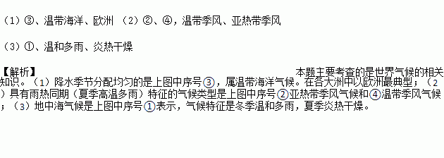 (1)降水季节分配均匀的是上图中序号 ,属 气候。在各大洲中以 洲最典型。