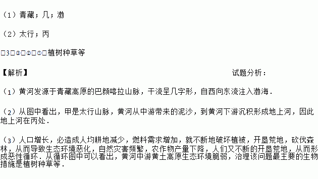 (1)青藏;几;渤 (2)太行;丙 (3)③,②,①,植树种草等 【解析】试题分析: (1)黄河发源于青藏高原的巴颜喀拉山脉,干流呈几字形,自西向东流注入渤海. (2)从图中看出,甲是太行山脉,黄河从中游带来的泥沙,到黄河下游沉积形成地上河,因此地上河在丙处. (3)人口增长,必造成人均耕地减少,燃料需求增加,就不断地破坏植被,开垦荒地,砍伐森林,从而导致生态环...