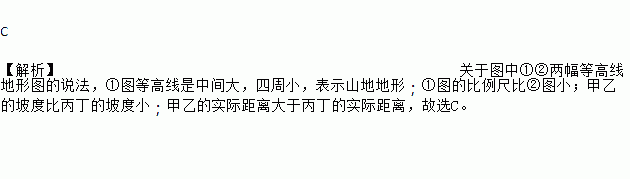 C 【解析】关于图中①②两幅等高线地形图的说法,①图等高线是中间大,四周小,表示山地地形;①图的比例尺比②图小;甲乙的坡度比丙丁的坡度小;甲乙的实际距离大于丙丁的实际距离,故选C。