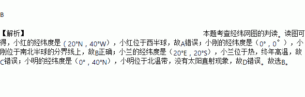A. 小红站在东、西半球的分界线上 B. 小刚站在南、北半球的分界线上