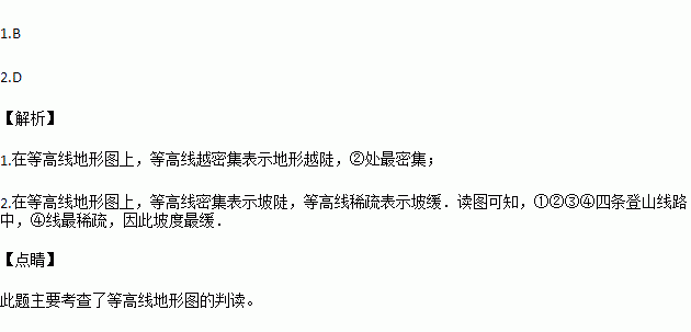 2.图中的①②③④四条登山线路中,坡度最缓的是( )