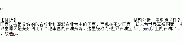 D 【解析】试题分析:中东地区许多国家过去是贫穷的以农牧业和灌溉农业为主的国家,而现在不少国家一跃成为世界富裕国家,其致富原因是充分利用了当地丰富的石油资源,这里被称为“世界石油宝库”,90%以上的石油出口,故选D。