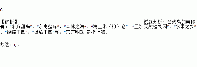 C 【解析】试题分析:台湾岛的美称有:“东方甜岛”、“东南盐库”、“森林之海”、“海上米(粮)仓”、“亚洲天然植物园”、“水果之乡”、“蝴蝶王国”、“樟脑王国”等,“东方明珠”是指上海. 故选:C.