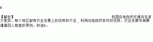 B 【解析】我国各地自然环境存在很大差异,每个地区都有农业发展上的优势和不足,利用当地自然条件的优势,农业发展布局要遵循因人制宜的原则,故选B。