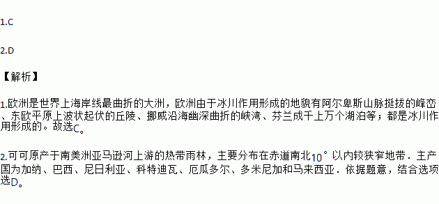 1.C 2.D 【解析】 1.欧洲是世界上海岸线最曲折的大洲,欧洲由于冰川作用形成的地貌有阿尔卑斯山脉挺拔的峰峦、东欧平原上波状起伏的丘陵、挪威沿海幽深曲折的峡湾、芬兰成千上万个湖泊等;都是冰川作用形成的。故选C。 2.可可原产于南美洲亚马逊河上游的热带雨林,主要分布在赤道南北10°以内较狭窄地带.主产国为加纳、巴西、尼日利亚、科特迪瓦、厄瓜多尔、多米尼加和马来西亚.依据题...
