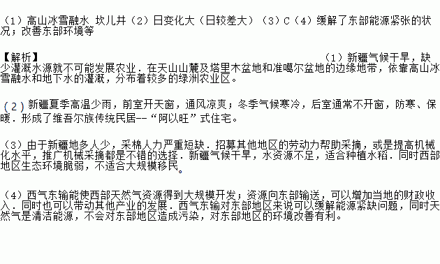 (1)同学们在去新疆的途中,看到河西走廊有很多绿洲,这些绿洲的水源主要来自 和地下水。在吐鲁番盆地人们用“ ”将水引到绿洲。