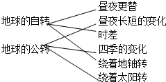 7.连线题分析 地球自转的周期是一天,自转的方向是自西向东,产生的地理现象有昼夜交替、时间差异、日月星辰的东升西落.地球公转的周期是一年;公转的方向是自西向东;产生的地理现象有昼夜长短的变化、四季的形成、正午太阳高度的变化.